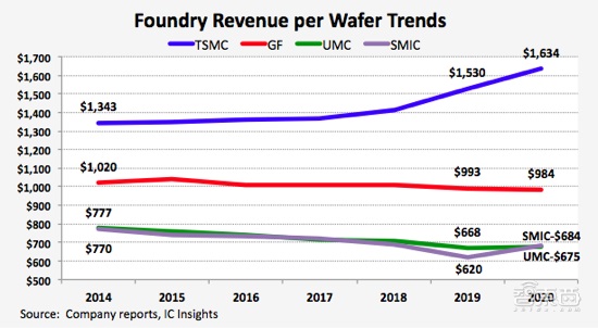 據 IC Insights 報(bào)告,2020 年(nián)台積電(d">∞iàn)每片晶圓營收為(wèi) 1634 美(měi)元,創下(x λià)曆史新高(gāo),比格羅方德高(gāo)出 66%。相(x₽iàng)比之下(xià),2019 年(n¶∞εián)該數(shù)字為(wèi) 1530 美(měi)元。